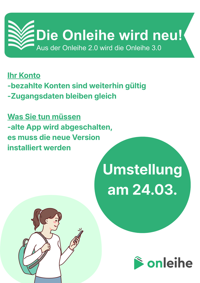 am 24.03.2026 wird die Onleihe auf die Version 3.0 umgestellt. Die bisherige App wird ab diesem Datum nicht mehr nutzbar sein. Nutzer der Onleihe müssen sich die neueste Version der App herunterladen.