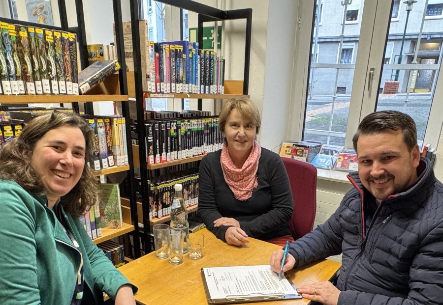 Am 10.12.2024 war es endlich so weit. Der Stadtbürgermeister der Stadt Bad Ems, Oliver Krügel, traf sich mit den Leitungen der Kindertagesstätte Eisenbach sowie der Stadtbücherei Bad Ems in den Räumen der Bibliothek um gemeinsam den neu entstandenen Kooperationsvertrag zwischen den beiden städtischen Einrichtungen zu unterzeichnen. Dieser war auf Anraten und mit der Unterstützung des Landesbibliothekszentrums in Koblenz entstanden, um die bereits seit Langem existierende Zusammenarbeit der beiden Bildungspartner vertraglich festzuschreiben und damit die Umsetzung der genannten Ziele auch unabhängig von einzelnen Personen zukunftsfähig zu gewährleisten. Dabei wurden unter anderem die Häufigkeit der in der Bücherei stattfindenden Vorlesestunden für die Maxi-Kinder, die Möglichkeit zur Ausleihe von Themenkisten, die Unterstützung bei der Ausbildung der „Early Literacy“ der Kinder, die Bereitstellung entsprechender Fachliteratur und vieles mehr festgehalten: ein Weg, den die Stadtbücherei auch noch mit weiteren Institutionen der Umgebung gehen möchte, um unter anderem die Leseförderung unter den beiden Mottos des Landesbibliothekszentrums Rheinland-Pfalz „Bildungspartner Bibliothek und Kita“ sowie „Bildungspartner Bibliothek und Schule“ voranzutreiben.